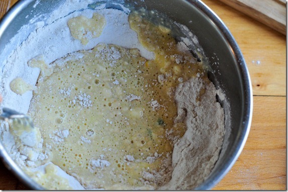 Mix and pour into the dry ingredients. Just a little mixing. You do not need to stir and stir and stir. I got into stirring and stirring and watching the gluten strings form. They turned out fine but they might’ve been fluffier if I’d just combined the ingredients.